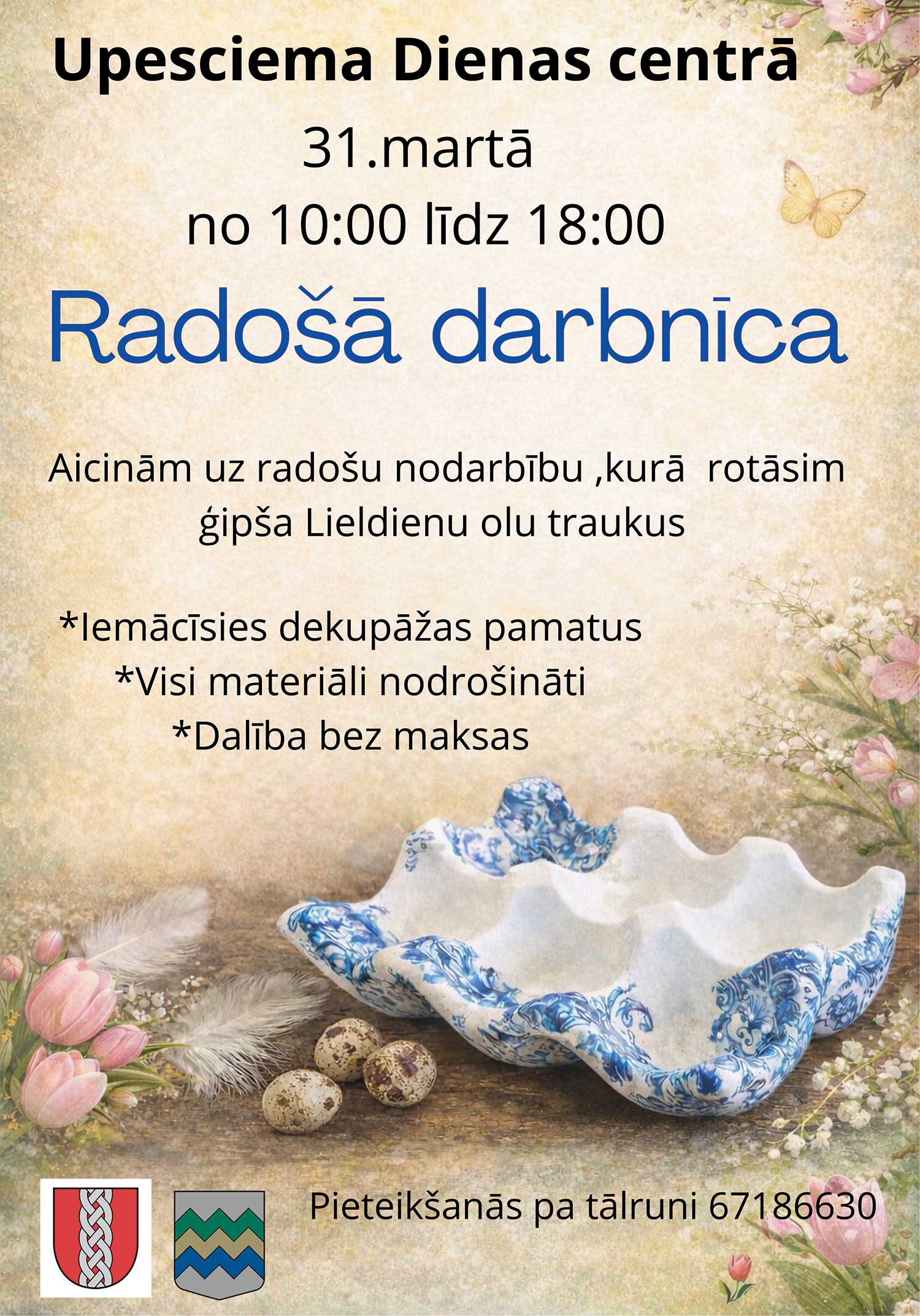 Meistarklasi vadīs Sanita Kanneniece. Dalībnieki varēs izrotāt olu trauciņus dekupāžas tehnikā, lai godam sagaidītu Lieldienas.