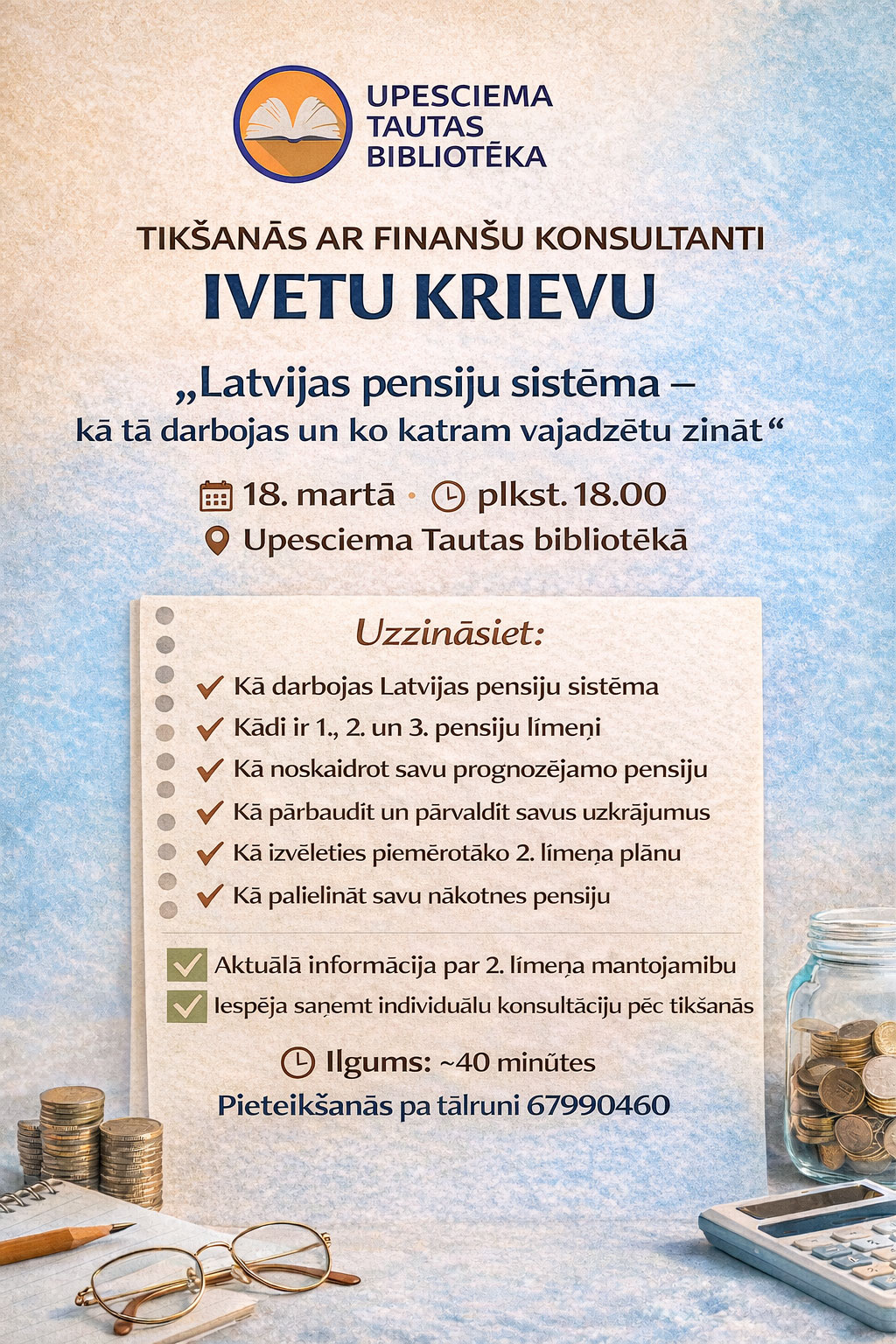 Visi, kuriem tuvojas pensijas brīdis laipni lūgti uz tikšanos ar finanšu konsultanti Ivetu Krievu, kura izstāstīs visu, kas jāzina, lai godam sagatavotos šim brīdim.